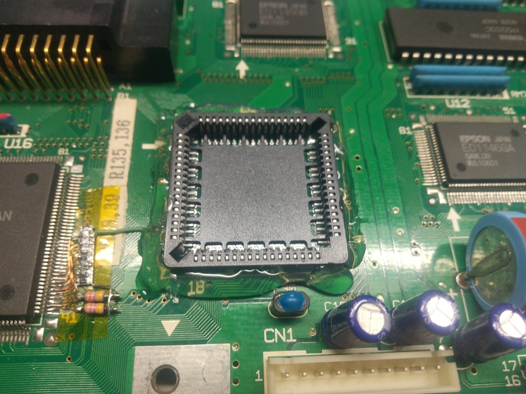 から、PLCCソケット周りをグルーガンで固めて多少の力がかかっても問題ないように補強してあります