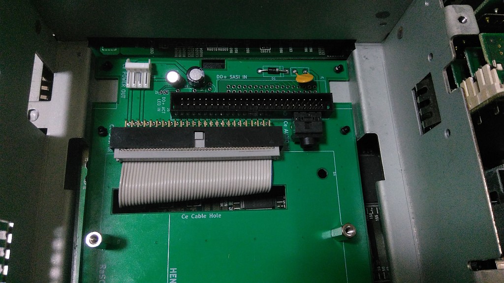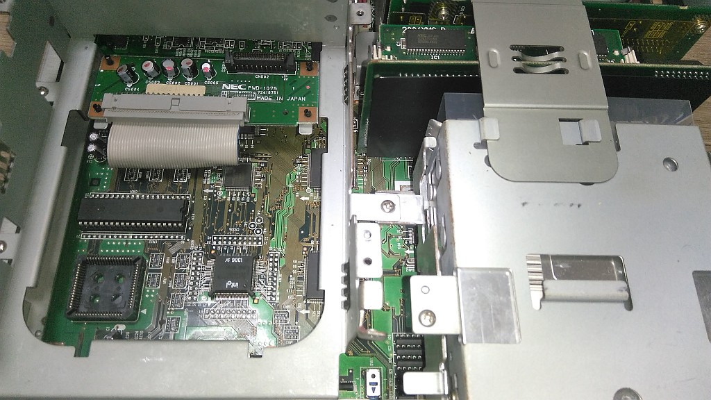 変換基板を取り付けたカゴをPC-9821/Ceに取り付けます。取り付けの際、変換基板中央部に長方形の穴が開いて