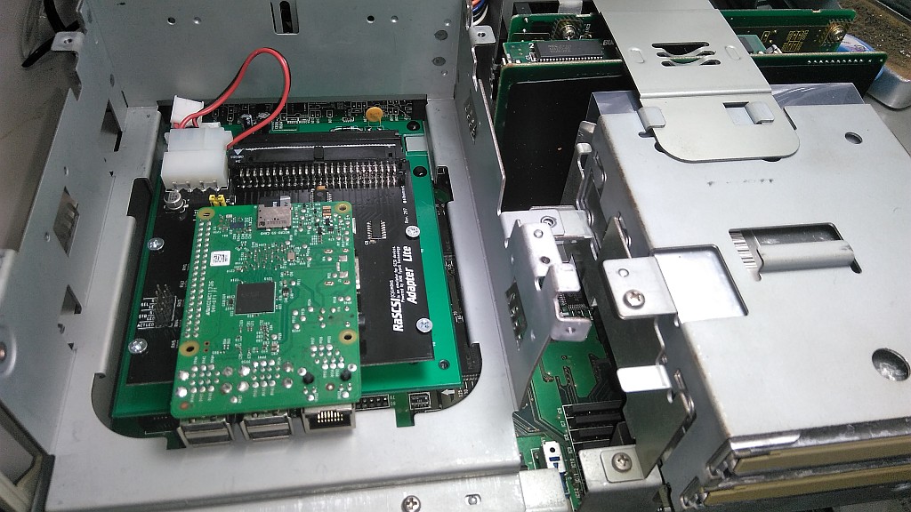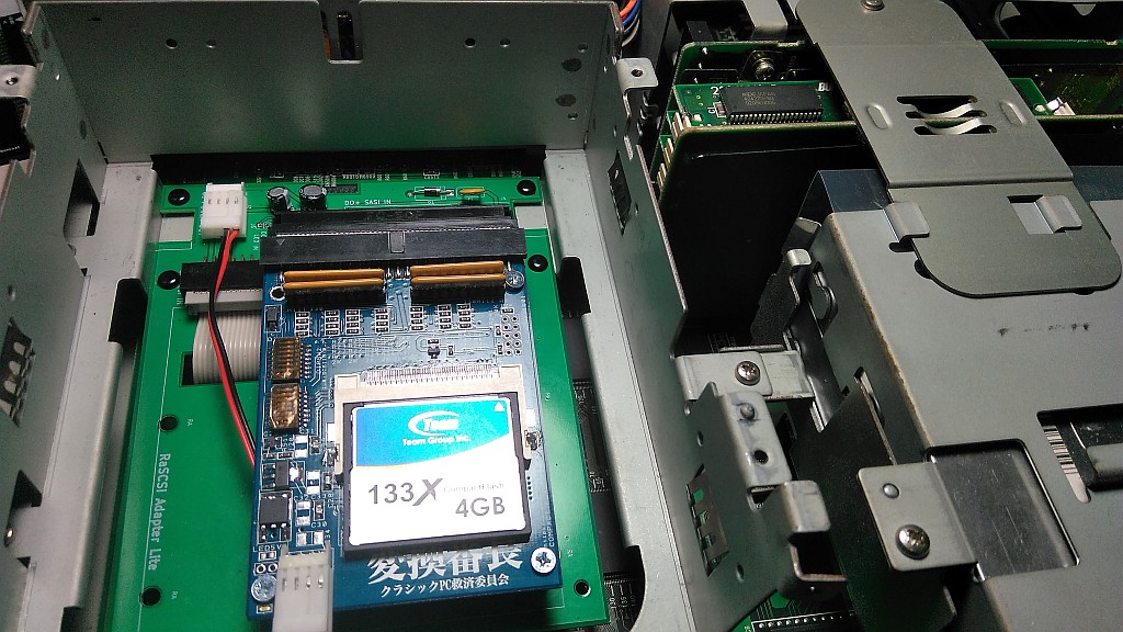 残りのネジ4個を使ってRaSCSI基板を固定します。超短ケーブルのたわみの影響でRaSCSIのネジ穴位置が若干ズレ