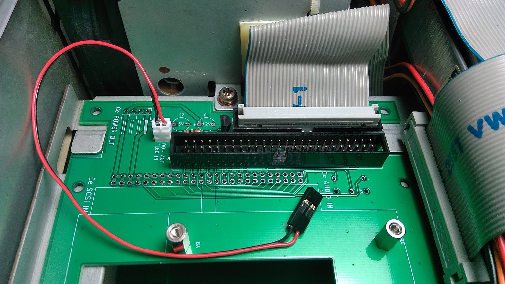 9:変換基板に先ほど接続したアクセスLED用 ケーブルをRaSCSIの「ACT LED」と書かれている ヘッダピンに取り付けます 赤黒の線が逆だと前面アクセスLEDが点灯しません ので方向をよく確認の上接続してください |
