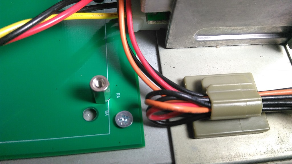 7:残った最後のネジを変換基板のコネクタ類が 密集している所から見て右下にあるネジ穴に差し込み 基板自体を固定します。うまくネジ穴が合わない場合 はフロッピー2ドライブの電源コネクタを若干持ち 上げつつ基板をスライドさせてあげるとうまく ネジ穴が合うと思います 注釈: 見やすくするためにRaSCSIを外して撮影しています |