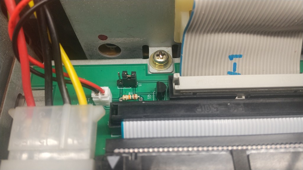10:DO+のSASIコネクタ側にジャンパピンが あります。このジャンパピンを手前から見て右側に 挿し替えます(初期は左側に挿さっているはず) このジャンパはアクセスLEDの極性変更ジャンパです SxSIエミュレータによってLED出力仕様が異なるため 必要に応じて切り替えてください ※設定が合わないと前面のHDD LEDが点灯しないか 点灯しっぱなしの状態になります |