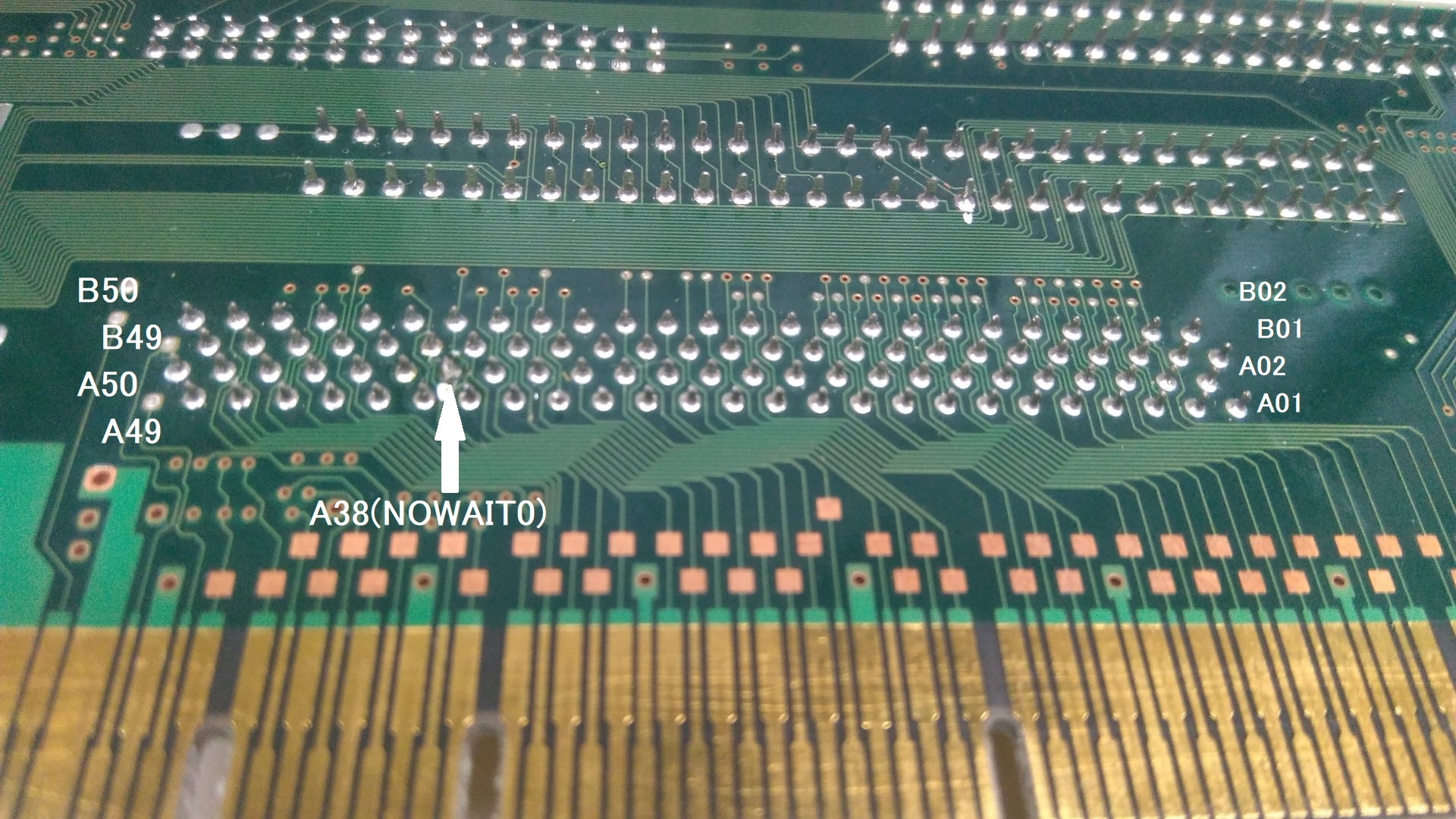 左画像(HDサイズの大きな画像でご覧いただけます):の上記白枠内コネクタA38ピン(CバスのNOWAIT0信号)と