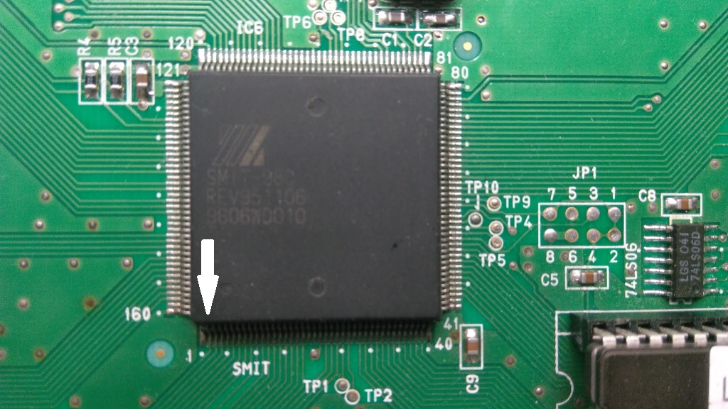 SMIT-98Cチップの1ピン位置写真(矢印の所)、PM-SC301NSの1ピン位置は三角のシルクがあります