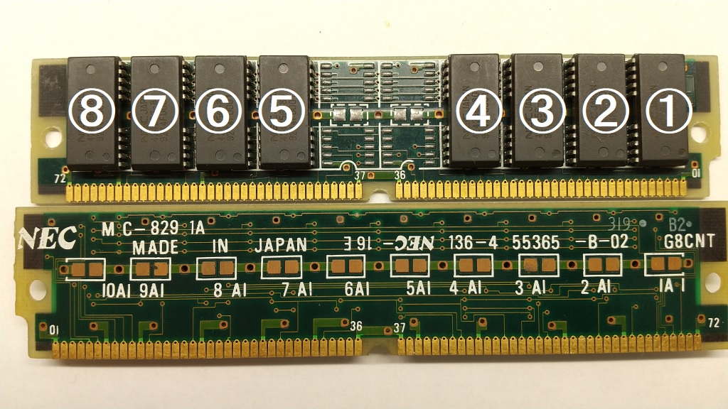 ところでこのSIMM、切込みがある方を1ピンだとすると、チップはSIMMの裏面に付いていることになる