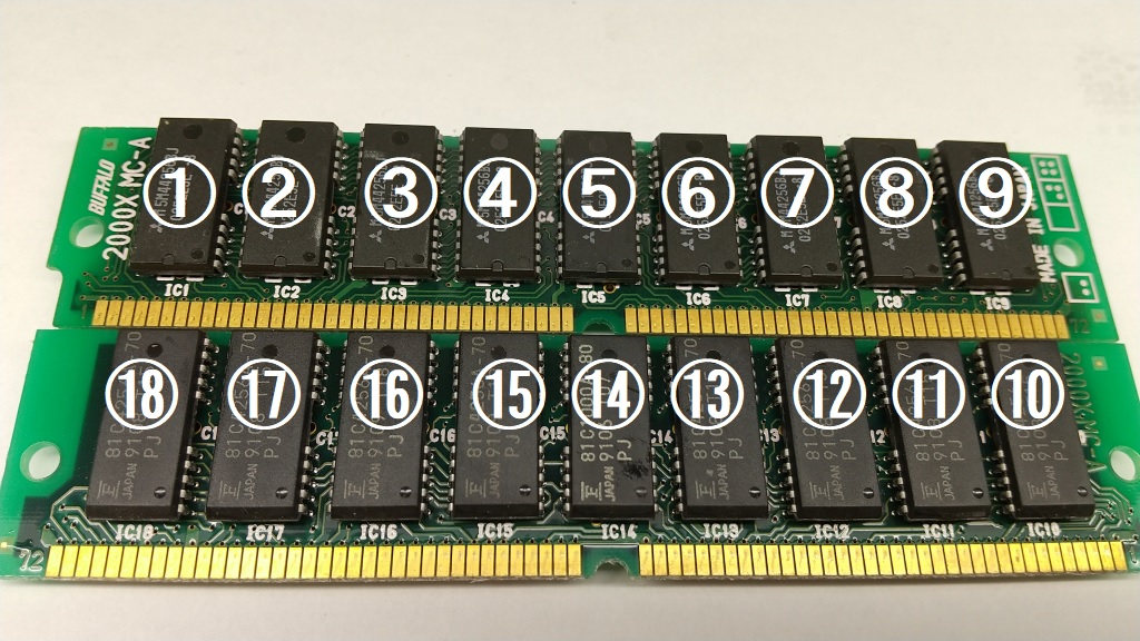 SIMM仕様:256k word×4bit(1チップ128KiB)×16=2MiB+1bitパリティチップ×2